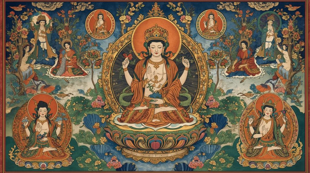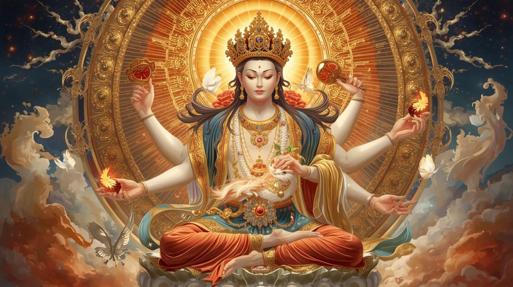 Маричи — это и свет, и щит. Певшие её мантры не просто набор звуков: они структурируют поле сознания, выделяют священный коридор между целителем и тем, кто получает лечение, между путником и дорогой. В основании практики — представление, что свет Солнца и Луны, соединённый с мудростью Вайрочаны, способeн запечатать глаза и рты зла, не допустить заражения и утратить власть над живым.